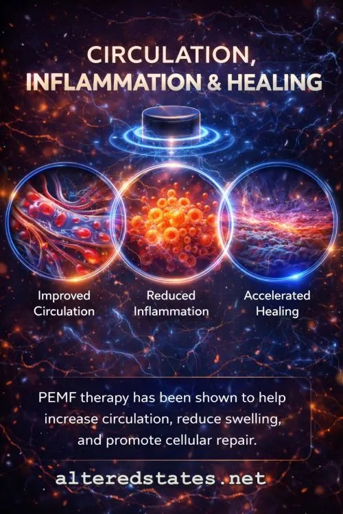 🔁 Circulation, Inflammation & Healing Chronic pain is often linked to: • 🔄 Poor circulation PEMF may help by: • ❤️ Increasing blood flow This creates a more favorable environment for healing.