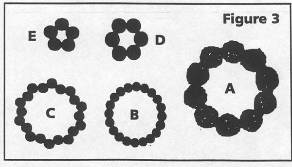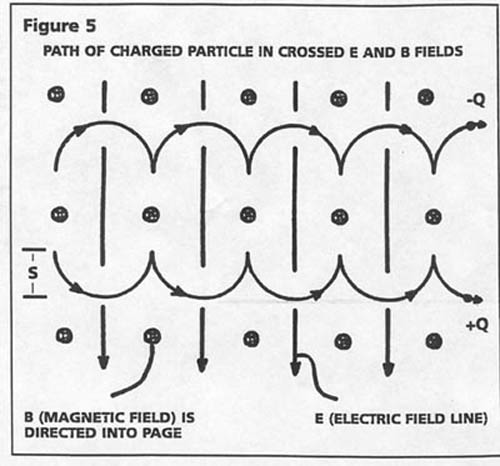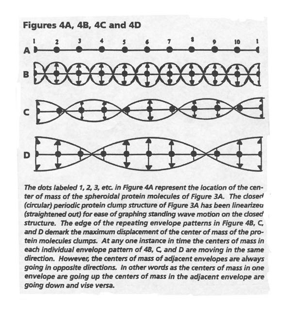 structure (capsid Figure 2A and B illustrate two specific examples of virus capsid coats. The dark disks in Figures 2A and B represent individual single protein molecule spheroids. These spheroidal protein molecules are weakly bonded to each other. This spheroidal protein structure is elastic. If the protein capsid coats illustrated in Figure 2A and B are folded up to form the completed virus capsid coat illustrated in Figure 1B, a structure will have been formed that has periodically spaced, elastically coupled, protein clumps that close back on themselves. As previously stated these closed on themselves periodically spaced protein structures can support resonant standing mechanical waves. Figure 3 shows several examples of these periodically spaced closed structures found on the capsid coats formed from the examples of Figures 2A and B. The bond between these adjacent protein molecules are relatively weak. This means that if the amplitude (displacement from rest position) of the protein molecules becomes too large during mechanical oscillation, the physical / chemical bonds between the adjacent molecules will rupture and this essential microbe structure is destroyed. An ultrasound generator can supply the mechanical oscillations. Figure 4A,B,C,D shows the periodically spaced closed structure of Figure 3A laid out linearly for ease of graphic display. Figure 4B,C,and D illustrate some of the standing mechanical wave oscillation modes that the periodically spaced closed structure of Figure 3A can support. The standing wave mode illustrated in Figure 4B where the adjacent protein clumps oscillate 180 degrees out of phase is the most stressful oscillation mode. When adjacent protein clumps oscillate 180 degrees out of phase, one protein clump is moving upward while its adjacent clumps are moving downward and visa versa. At maximum displacement of the protein clump from their equilibrium position, the stress at where the adjacent protein clumps are joined become a maximum. If the stress becomes large enough the bonding between adjacent protein clumps breaks down and the essential or critical structure for holding and delivering the virus genetic material is critically damaged or destroyed. This means the virus can not infect a new cell. Also, viruses that are forming and budding off of infected cells can be destroyed by this same method. This destruction / disintegration of forming and budding off viruses leaves holes in the infected cell's membrane, which can be fatal to the infected cell, which is actively producing viruses. ENTER THE PULSED MAGNETIC FIELD If the charged particle released from rest in such a crossed magnetic and electric field is a proton embedded in water, then as the proton attempts to execute the motion depicted in Figure 6A, it must collide with / move about adjacent water molecules. It does this moving about of adjacent water molecules in a periodic fashion as depicted in Figure 6. This periodic moving back and forth of water molecules is the generation of ultrasound. Regular water at room temperature has approximately one in a million water molecules at any instant in time disassociated into a hydroxyl ion (OH-) and a hydronium ion (H+) . Both the hydroxyl and the hydronium ion in water will attempt to execute the motion illustrated in Figure 5 , if exposed to the crossed electric and magnetic fields. However, the hydronium ion will execute the motion at a much higher rate (frequency) then the hydroxyl ion because of it's much smaller mass (*) For our more technically trained readers, I have written the