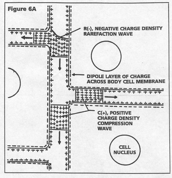 the article. Answer: You expose the water to a changing magnetic field strength. It is known from experiment and theory, that when a magnetic field at some location is changing in strength, an electric field is created with it's direction at right angles to the direction of the existing magnetic field at that location. In other words a crossed magnetic and electric field as illustrated in Figure 5. The frequency of mechanical oscillation is directly proportional to the magnetic field strength. For example, if you increase the magnetic field strength by a factor of ten, then the frequency of ultrasound generated by the ion oscillation increases by a factor of ten. The amplitude (displacement) of oscillation is directly proportional to the electric field strength. The electric field strength is determined by how fast the magnetic field strength is changing. It is directly proportional to the instantaneous rate of change of the magnetic field strength. So, to have both higher frequencies of ultrasound generated and for these frequencies to have high intensity / amplitude, the magnetic field at the location of interest must be both very strong and be changing it's strength at a high rate. Hence, what is required is a high intensity pulsed magnetic field. This is achieved by rapidly discharging a high voltage capacitor through an appropriately designed wire coil. If such a coil is placed on the surface of a person, when it has a high voltage capacitor discharge through it, it produces a continuum of magnetic field strength throughout the body and therefore a continuum of oscillation frequencies throughout the body along with a continuum of associated oscillation amplitudes. The highest ultrasound frequencies with also the highest displacement amplitudes will be generated by hydronium ions directly under where the coil is placed. The lowest frequencies and lowest amplitudes of oscillation will be at body locations farthest from the coil. Each time the high voltage capacitor is discharged through the coil, the electric current oscillates back and forth between the coil and the capacitor for approximately ten oscillations for most capacitor and coil combinations of interest. Each oscillation cycle being a little weaker than the pervious one. During each of these ring down oscillations a crossed electric and magnetic field is generated in animal tissue with the concurrent generation of broad band ultrasound, which can destroy the critical periodically spaced closed on themselves protein structures of microbes. ENTER CHARGE DENSITY WAVES That is the positive ions such as potassium, sodium, magnesium, calcium, etc. and the negatively charged ions such as chlorine, hydroxyl ion, etc. separate themselves into two opposing layers of higher than normal concentration of each ion in one of the layers and low than normal concentration in the other layer. During the dipole charge layer formation process, which is being driven by the transient electric field, some ion types are being drawn in toward the dead skin layer while others are being forced away from the dead skin layer. This is a dynamic process, when those ions are pulled toward the dead skin layer, they leave behind a vacancy in their concentration which is filled in by adjacent ions of their own kind and in turn these ions leave a vacancy which is filled in by adjacent ions of their own kind. In this way a rareification wave of ion density is propagated away from the dipole layer generation region and into the body interior. Similarly, when a ion type is forced away from the dead skin layer by the transient electric field, a compression (higher than normal concentration) of that ion is formed and this compression wave is also propagated into the body interior. Since these charge density waves are effectively traveling excesses of either positive or negative charge, they have traveling electric fields associated with them. These traveling electric fields can when strong enough denature / rearrange essential delicate protein structures on virus and bacterial surfaces. One good example of this sort a activity, is the denaturing of the proteins of snake venom by charge density waves generated from shocking the snake bite region with high voltage discharges from the spark coil of a car. Another example, the HIV virus has a glycoprotein molecule known as gp-120 displayed on it's surface. This protein is designed to match up and attach to a very specific protein CD4 on the target cell membrane. If the very specific shape, size, and charge configuration of the gp-120 is rearranged / changed by the transient electric field from the charge density wave, then gp-120 can not attach to CD4 and the virus can not infect the target cells. The virus is effectively destroyed. This displaying on the virus surface of a specific protein with a specific size, shape, and charge configuration to attach to a specific protein on the target cell is a standard virus attribute and therefore provides for a simple method to deactivate viruses. It should also be pointed out that the electric fields from the net charge of the charge density waves causes adjacent cell membranes to move to and fro as the charge density waves pass between them and or around them (see Figure 6A & Figure 6 B,C ). This is do to the fact that body cells maintain a dipole charge layer across their bi-lipid cell membranes. The electric field of the charge density wave reacts with the charges of the cell's dipole charge layer to make the cell membrane act like a sound speaker diaphragm. However, here we are dealing with diaphragm oscillation rates in the million cycles per second range (ultrasound). This form of broad band ultrasound generation can also destroy microorganisms. Now that we have a some understanding of how a crossed electric and magnetic field and charge density waves can be used to generate broad band ultrasound in body fluids (saline solutions), consider the circuit schematic of Figure 7
