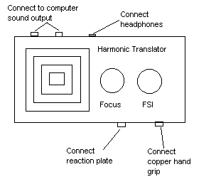 effected. Focus and FSI settings on the translation device: Focus: The purpose of the focus adjustment is to compensate for distortions in local electromagnetic fields. The focus knob should start out in the center position. Turn the knob back and forth one or two times until you feel a reaction on the reaction plate. This is the electromagnetic focal point of highest resolution for the electromagnetic information being output on the translator device. FSI: Before running a healing session, you must set the FSI knob on the translator