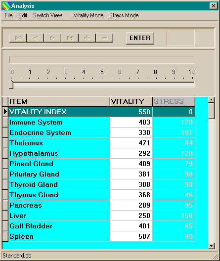 Analysis Making sense of H T analysis readings Vitality Index reading: The first reading at the top of most lists is Vitality Index. This reading is always between 500 and 700 and is used to adjust the reading to the individuals energetic levels. All subsequent readings in Vitality Mode will be compared to the Vitality Index. There are two categories of analysis readings. Vitality readings are a measure of the relative level of energy present or the potential level of an energetic response. Vitality readings are always read relative to the Vitality Index reading which is the individual’s base line reading for the current session. Vitality readings that are within 200 points of the Vitality Index are considered good. Vitality readings that are below 200 points of the index are considered too low. For example, with an index reading of 550 the liver is found to read 250. That is 300 points below the index and indicates that the liver is energetically very low. When taking readings on food items or supplements, a vitality reading that comes as close as possible to the index is an indication that that food or supplement is good to include in the diet. If the reading on the food or supplement item is below 200 points of the index, that item should be avoided. Stress readings are a measure of distress in tissues or the potential for