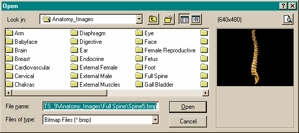 Composing a healing session: image: Start by selecting an anatomical image of the body, body part, organ system or organ that is the focus of the work you wish to do. image selection is optional. Click on image from the translation menu bar. Select the category folder that you think appropriate. Click on the image file you think appropriate. A thumbnail sample of the image will appear. If this image is the one you wish to use, double click on the file or click on open. If you wish to work on only a part of the anatomy displayed, you can use your mouse to click and drag a target box over the part of the image you wish to effect. Adding a new image: You can add any new image to the H T System so long as it is in bit map (.bmp) format. images work best when they are no larger than 640 by 480 pixels. Drawing a target box to focus the healing effect: Whenever you have an image displayed in the Translation window you can define the area you wish to work on with a target box. With your mouse, go to the upper left hand corner of the area you wish to work on, click and drag the target box to any size needed. You can make the target box as large as the whole image if you wish or as small as needed. If you do not draw a target box on the displayed image, the healing effect of the session will be full body.