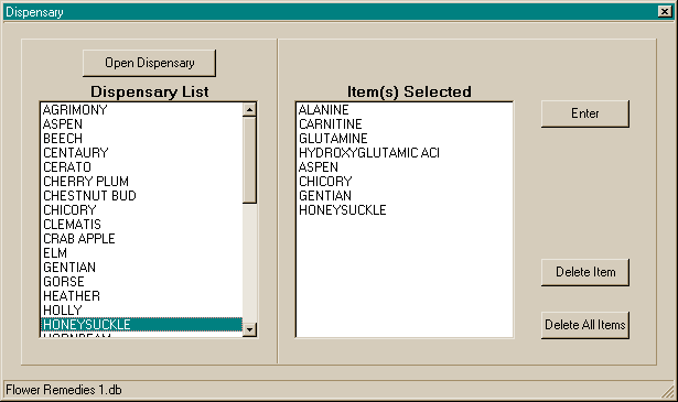 program. Using the Data Matrix utility to enter new medicinal items into the Dispensary: From the Utilities menu select Dispensary Data Matrix. To add a medicinal item to an existing category, first select Open Category form the data matrix File menu. Select the category you wish to add to and double click on it. Next click on New Matrix from the menu bar. Now type in the name of the new item. Place the sample of the medicinal item on the translator device. Be sure that the FSI setting is at 0. With your hand on the reaction plate, use your mouse cursor to slowly move down the left hand column of the matrix until you feel the reaction on the plate. Click on the matrix square that gives you the reaction. Move to the next column and repeat the procedure. When you have registered a number in each of the thirteen columns select Enter Matrix from the menu bar. Then from the File menu select Save Matrix. Your new item now appears in the list of items in the selected category. To delete an item from a category, simply hi light the item from the category list and click on the (-) button. To create a new dispensary category , select Make Category from the file menu. Type the name of the new category and hit Save. To then add items to this new category, select Open Category and click on the new category and repeat the procedures above. Convert old HT (ver. 6 ) data base category files: To convert old (ver. 6 ) data base category files to a new (ver. 9) dispensary category folder, select Group file to Dispensary Converter from the Utilities menu. Click on the Open Legacy Group File button. Select the H T 6 group file to be converted. Rename the file as you wish. It can be the same name if you chouse. Click on the Convert to Dispensary button. If you wish to convert another file it is recommended that you exit the program and then return to the Group File to Dispensary Converter and repeat the procedure above. |