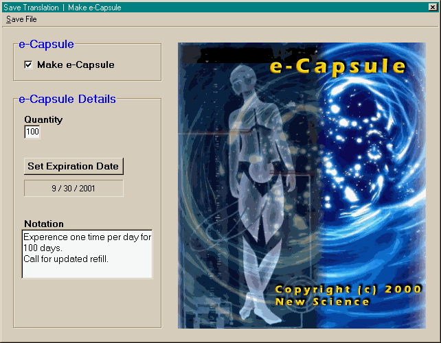 Making an e-Capsule from a translation session: Any complete translation healing session can be transcribed into e-Capsule form for easy transmission via e mail to a client. Click on File from the menu bar and click on Save Translation / Make e-Capsule. Check the Make e-Capsule box. Enter the number of doses (times the treatment will run on the clients computer). This can be 1 to 999. Click on Enter Expiration Date. Click on the day of the year that you want the e-capsule to expire. Double click on the blue date bar to confirm the expiration date. Enter any notes to the client about using the e-Capsule in the Notation box. Click on Save file and name the e-capsule file. Click on Save. The e-Capsule file will be saved in the e-Capsule folder on your hard drive. The session that the e-Capsule was derived from will also be saved in the sessions folder on the hard drive. Note: It is best to use a large (full screen) target box or at least as large as is practical when making an e-Capsule so that the display on the e-Dispenser will be sufficiently large. To send the E-Capsule to a client with e mail, simply send as an attached