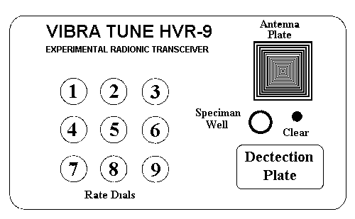 The main function of the HVR-9 is to detect or transmit radionic "rates". The radionic rate is not a "frequency" per se, but is a complex of etheric tones which create a shape or effect in the physical world. By dialling in diverse rates on the HVR-9 instrument plate one may specifically search out distinct energy patterns in specific subjects or subject locations.
